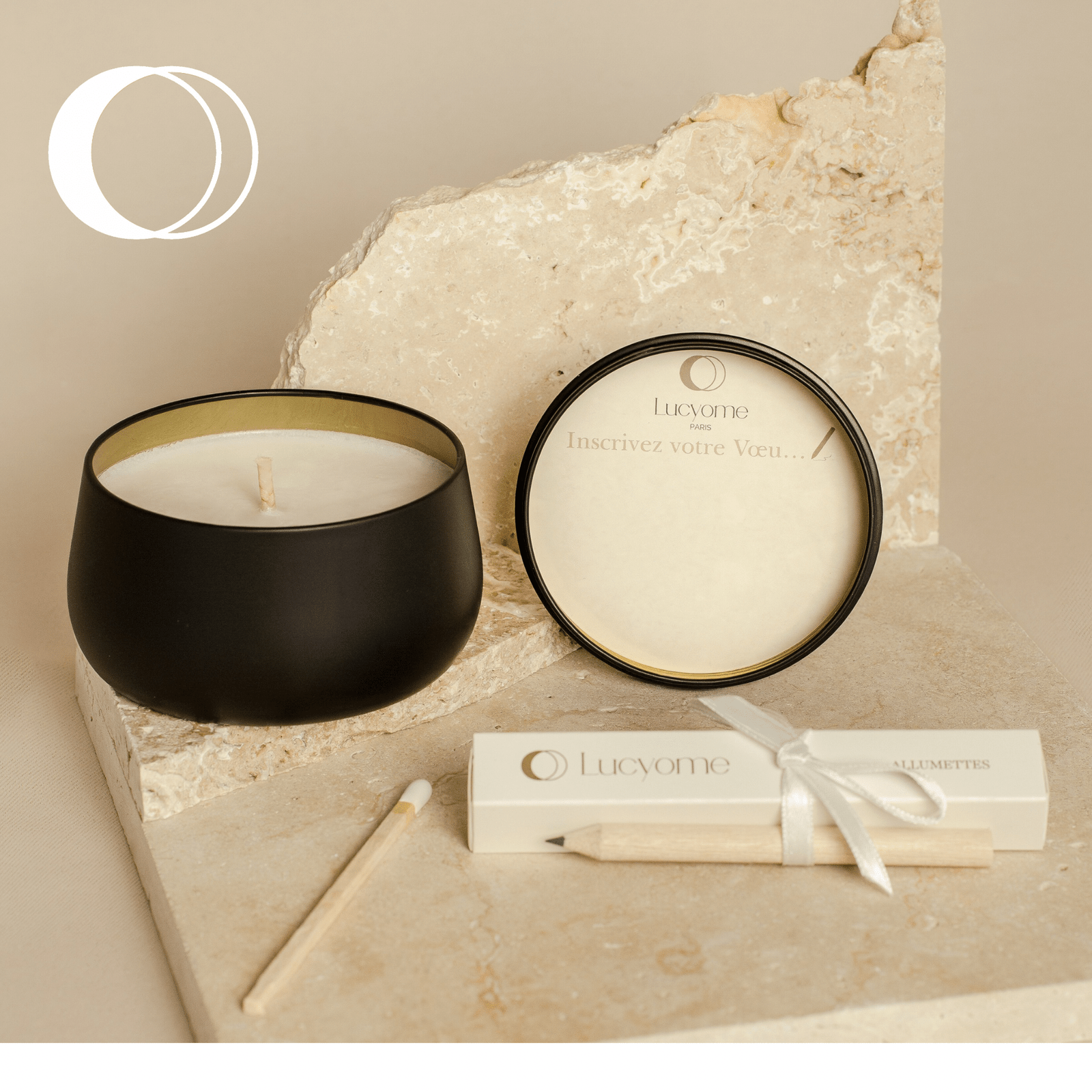Bougie 180 g colza, parfum sans CMR, mèche coton. Inclus : éclipse bois, crayon, allumettes, pochette craft bronze doré.