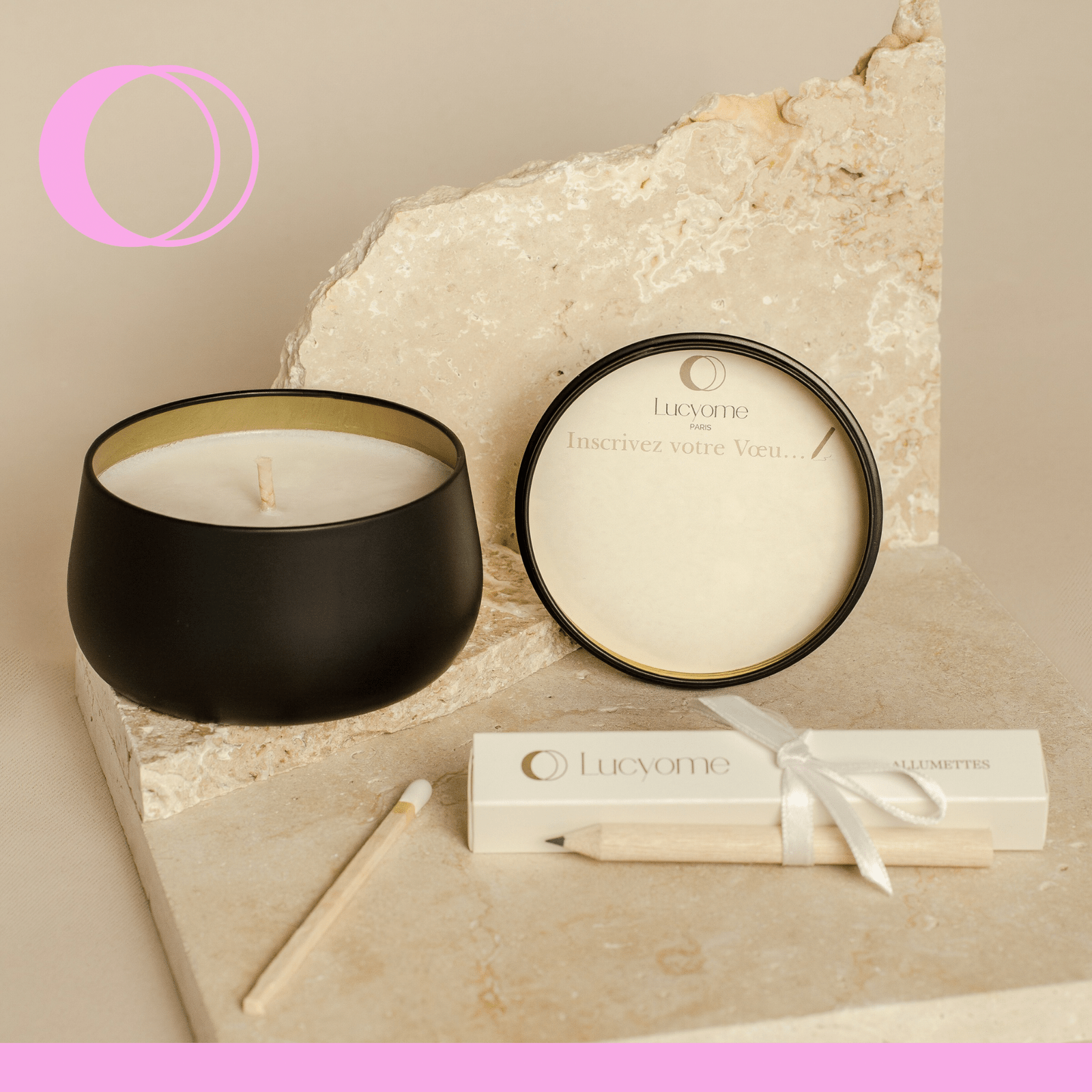 Bougie 180 g colza, parfum sans CMR, mèche coton. Inclus : éclipse bois, crayon, allumettes, pochette craft bronze doré.