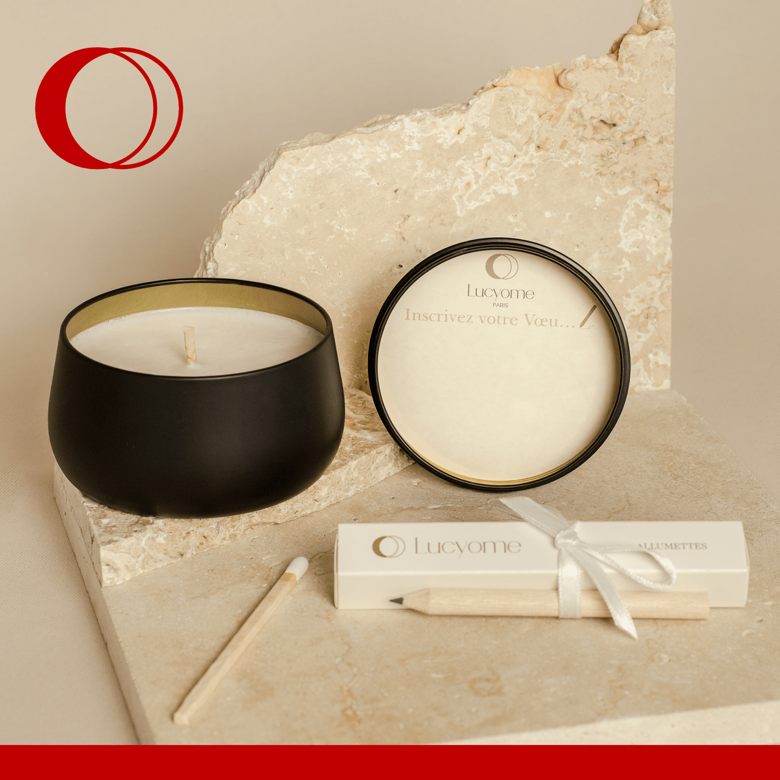Chaque bougie Lucyome offre la possibilité de faire un vœu en inscrivant son souhait sur le couvercle ou le socle avant d’allumer la flamme.