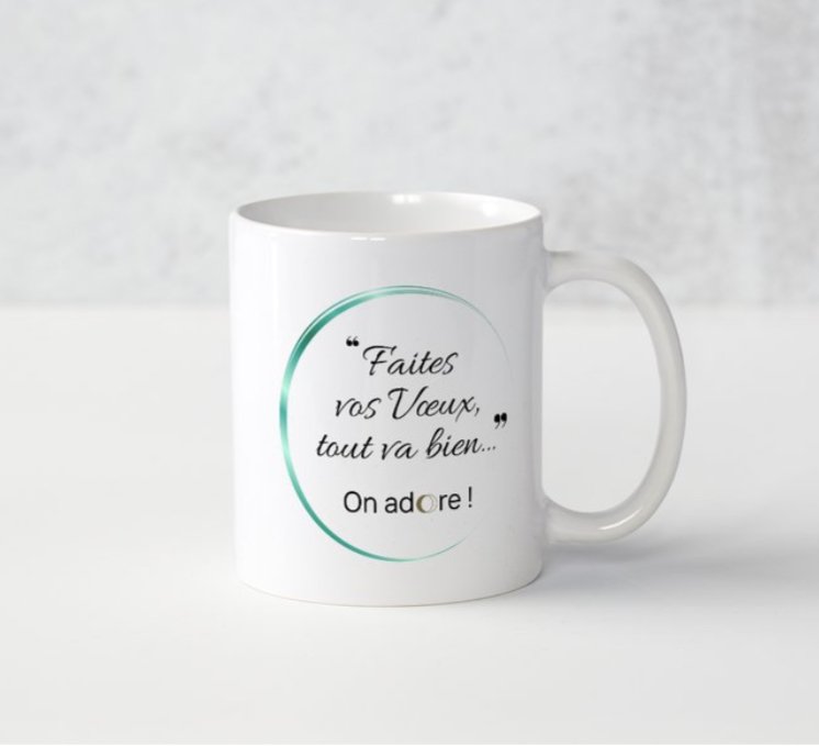 Mug blanc cercle vert. Message : « Faites vos Vœux, tout va bien… ! »